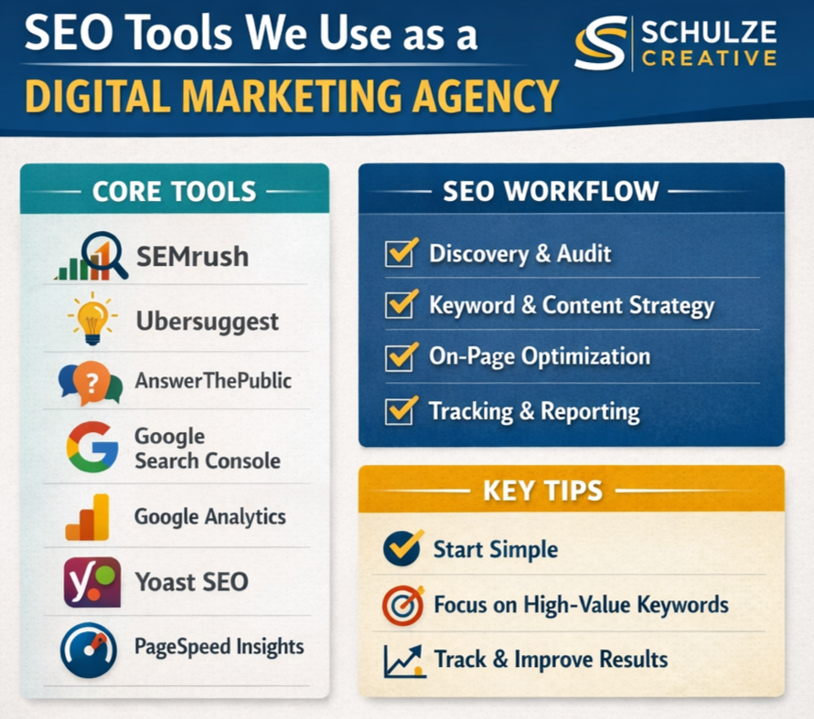 I want to show you exactly which SEO tools we use at Schulze Creative to get consistent, trackable results for our clients. These are tools that actually make a difference, not just dashboards full of confusing numbers. By the end of this guide, you will understand how to use these tools, what each one does, and how they can help you attract more leads and grow your business online.